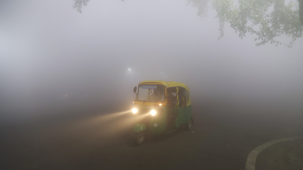 घने कोहरे के बीच गुजरता ऑटो