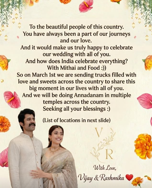 विजय रश्मिका ने आधिकारिक सोशल मीडिया अकाउंट से इसी घोषणा करते हुए लिखा है, इस देश के खूबसूरत लोगों के नाम, आप हमेशा हमारी यात्रा और हमारे प्यार का हिस्सा रहे हैं। हम सच में बहुत खुश होंगे अगर हम अपनी शादी का जश्न आप सभी के साथ मना सकें। और भारत हर खुशी कैसे मनाता है? मिठाई और खाने के साथ। इसलिए 1 मार्च को हम पूरे देश में प्यार और मिठाइयों से भरे ट्रक भेज रहे हैं, ताकि अपने जीवन के इस खास पल को आप सभी के साथ साझा कर सकें। हम देशभर के कई मंदिरों में अन्नदान भी करेंगे। आप सभी का आशीर्वाद चाहते हैं। हम आपसे बहुत प्यार करते हैं, विजय और रश्मिका।