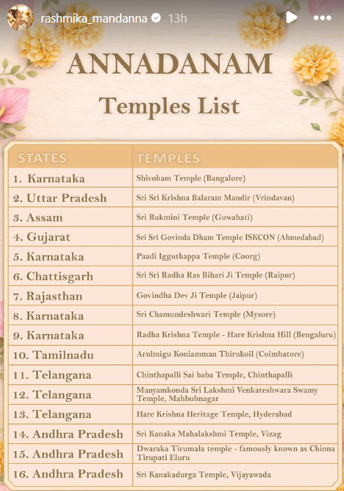 आगे रश्मिका मंदाना और विजय देवरकोंडा ने उन शहरों की सूची दी है, जहां वो मिठाइयां पहुंचा रहे हैं। इसके अलावा उन्होंने अन्नदान के लिए देशभर की 16 मंदिरों की सूची भी जारी की है, जिनमें कर्नाटक, आंध्रप्रदेश, छत्तीसगढ़, गुजरात, असम, राजस्थान की कई मंदिरें शामिल हैं।