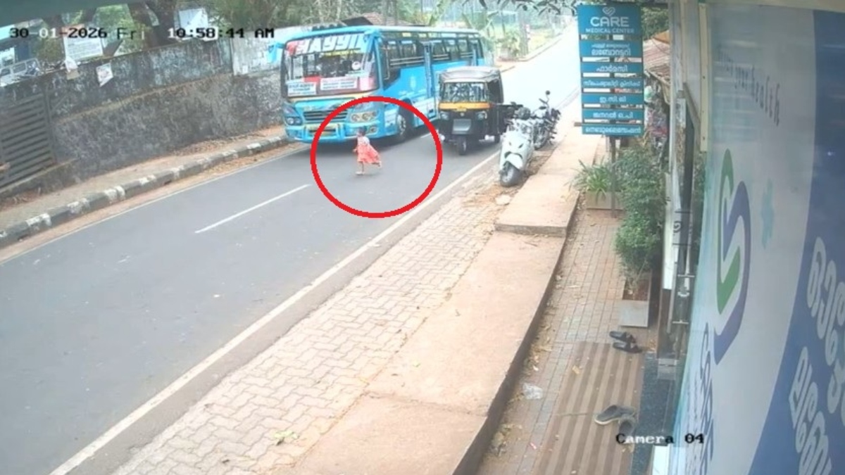 केरल के कोझिकोड जिले के कोडियाथुर इलाके से रोंगटे खड़े कर देने वाला वीडियो सामने आया है। वीडियो में देखा जा सकता कि एक बच्ची सड़क पर अचानक दौड़ पड़ी। इस दौरान एक बस आ रही है। बस की चपेट में आने से बच्ची बाल-बाल बच गई। बस चालक की सतर्कता की वजह से बच्ची बस के नीचे आने से बच गई। बच्ची की उम्र 3 साल बताई गई है।