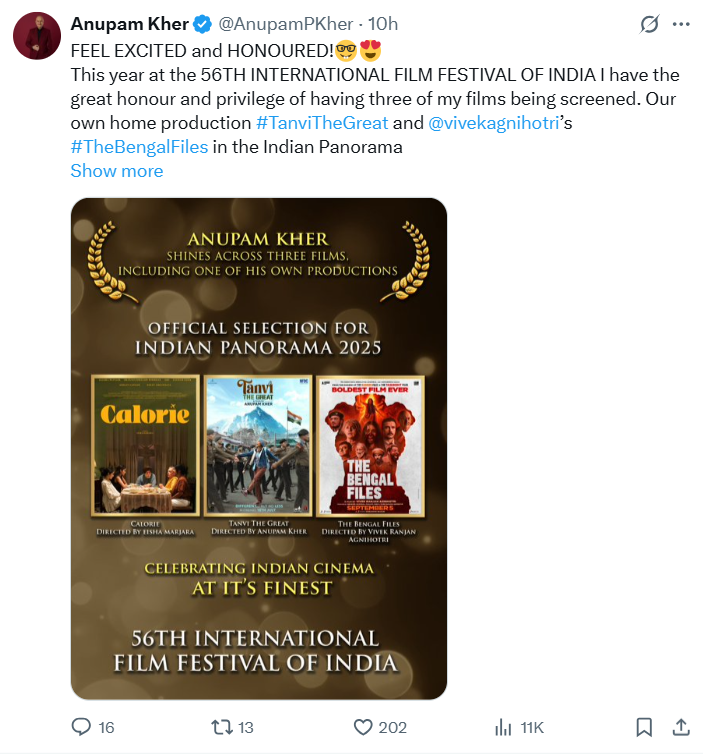 भारतीय पैनोरमा सेक्शन में हमारी अपनी होम प्रोडक्शन तन्वी दे ग्रेट, विवेक अग्निहोत्री की द बंगाल फाइल्स शामिल है और अंतर्राष्ट्रीय सेक्शन में मेरी एक खूबसूरत कनाडाई फिल्म कैलरी है।