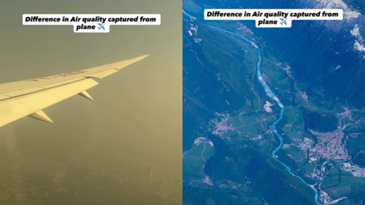 इंस्टाग्राम यूज़र लक्ष्य अरोड़ा ने विएना से दिल्ली की यात्रा करते समय यह वीडियो बनाया। उन्होंने दोनों शहरों के आसमान का नजारा शेयर किया, जिसमें एक तरफ ऑस्ट्रिया का साफ नीला आसमान, वहीं दूसरी ओर दिल्ली के ऊपर छाया हुआ धुंध, भूरा स्मॉग दिख रहा है।