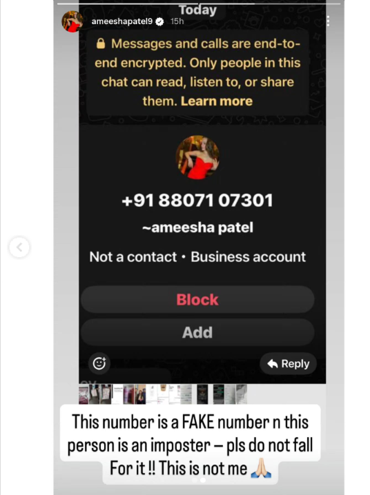इस पूरे मामले पर चिंता जताते हुए अमीषा ने कहा कि डिजिटल स्पेस में गलत सूचना कितनी आसानी से फैल सकते हैं, खासकर जब इसमें पब्लिक फिगर शामिल हों। इस मुद्दे की गंभीरता पर जोर देते हुए, उन्होंने फैंस को चेतावनी दी कि फर्जी नंबर के पीछे का व्यक्ति उनकी पहचान का दुरुपयोग करके लोगों को धोखा देने की कोशिश कर सकता है।