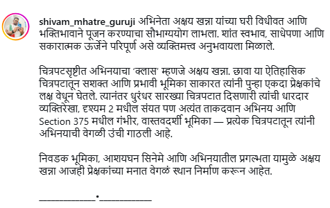 शिवम म्हात्रे ने अक्षय खन्ना की जमकर तारीफ की। उन्होंने लिखा कि अक्षय खन्ना एक्टिंग में क्लास की पहचान हैं। छावा, धुरंधर, दृश्यम 2 और सेक्शन 375 जैसी फिल्मों में उनकी परफॉर्मेंस शानदार रही है। वह अपने किरदार सोच-समझकर चुनते हैं और हर फिल्म में दमदार अभिनय करते हैं। इसी वजह से अक्षय खन्ना दर्शकों के दिलों में अपनी खास जगह बनाए हुए हैं।