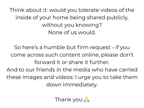 उन्होंने सवाल उठाते हुए आगे लिखा- ‘जरा सोचिए.. क्या आप अपने घर के अंदर के वीडियो को बिना आपकी जानकारी के सार्वजनिक रूप से शेयर किया जाना बर्दाश्त करेंगे? हममें से कोई भी ऐसा नहीं करेगा। एक विनम्र लेकिन सख्त अपील है कि अगर आपको ऑनलाइन ऐसा कोई कंटेंट मिलता है, तो प्लीज उसे फॉरवर्ड या शेयर न करें। और मीडिया के हमारे उन दोस्तों से, जिन्होंने ये तस्वीरें और वीडियो पोस्ट किए हैं, मैं आपसे रिक्वेस्ट करती हूं कि इन्हें तुरंत हटा दें। थैंक्यू.’