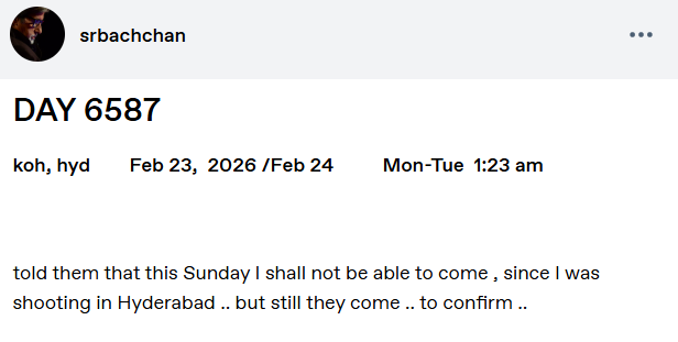 फिल्म की शूटिंग के चलते अमिताभ बच्चन इस रविवार अपने फैंस से नहीं मिल पाए। इसे लेकर उन्होंने लिखा, “उन्हें बताया कि इस रविवार मैं नहीं आ पाऊंगा, क्योंकि हैदराबाद में शूटिंग है… लेकिन फिर भी वे पुष्टि करने आ गए… माफी चाहता हूं, काम पहले, बाकी सब बाद में।”