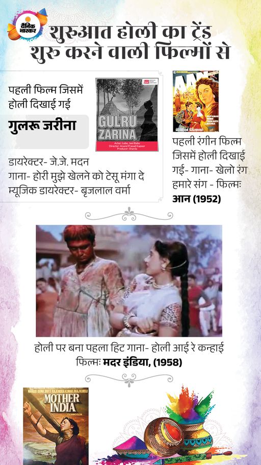 फिल्मों और होली का रिश्ता 94 सालों पुराना है। 1932 में पहली बार फिल्म गुलरू जरीना में होली थीम का ब्लैक एंड व्हाइट गाना ‘होरी मुझे खेलने को टेसू मंगा दे..’ दिखाया गया। हालांकि, इसे पॉपुलैरिटी नहीं मिली। इसके बाद महबूब खान ने फिल्म औरत (1940) में होली की खूबसूरती दिखाते हुए दो गाने डाले। रंगों वाली होली दिखी तो जरूर लेकिन ब्लैक एंड व्हाइट एरा में रंग नहीं दिखे।