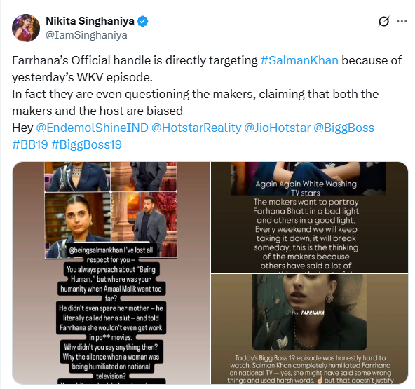 टेलीविजन का रियलिटी शो बिग बॉस 19 लगातार सुर्खियों में है। हाल ही में वीकेंड का वार एपिसोड में होस्ट सलमान खान ने फरहाना भट्ट को जमकर फटकार लगाई थी। हालांकि एपिसोड ऑन एयर होने के बाद कई फैंस ने फरहाना का सपोर्ट करते हुए सलमान खान के खिलाफ बयान दिए। अब फरहाना की पीआर टीम ने भी मेकर्स और सलमान के खिलाफ कई बयान पोस्ट करने शुरू कर दिए हैं।