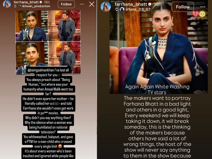 फरहान के अकाउंट से पोस्ट की गई स्टोरी में सलमान खान पर पक्षपात के आरोप लगाते हुए लिखा है, आपने उस आदमी (अमाल मलिक) के किए को सफेद झूठ से ढक दिया, उसे बचाया, और एक बिगड़े हुए बच्चे के लिए पेरेंट्स टीचर मीटिंग की तरह बर्ताव किया, जिसने हर हद पार कर दी। यह सिर्फ फरहाना की बात नहीं है, यह हर उस औरत की बात है जिसे अपमानित किया गया और लोग जैसे आप बस नजरें फेरकर चलते बने।