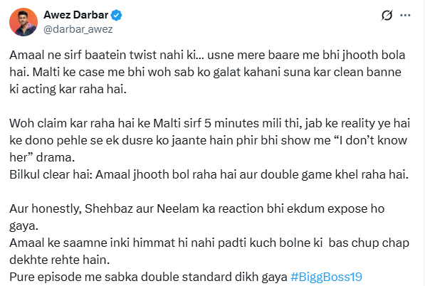 आवेज दरबार ने ऑफिशियल X अकाउंट (पहले ट्विटर) पर लिखा है, ‘अमाल ने सिर्फ बातें ट्विस्ट नहीं कीं, उसने मेरे बारे में भी झूठ बोला है। मालती के केस में भी वो सबको गलत कहानी सुनाकर क्लीन बनने की एक्टिंग कर रहा है। वो क्लेम कर रहा है कि मालती सिर्फ 5 मिनट मिली थी, जबकि रियलिटी ये है कि दोनों पहले से एक-दूसरे को जानते हैं, फिर भी शो में अमाल ‘मैं उसे नहीं जानता’ का ड्रामा कर रहा है।’