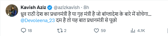 देवोलीना की पोस्ट सामने आने के बाद एक्स यूजर उनकी जमकर आलोचना कर रहे हैं। एक यूजर ने देवोलीना पर लिखा, ध्रुव राठी देश का प्रधानमंत्री है या गृहमंत्री है, जो बांग्लादेश के बारे में सोचेगा। देवोलीना दम है तो यह बात प्रधानमंत्री से पूछना।