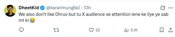 एक यूजर ने लिखा, हमें भी ध्रुव पसंद नहीं हैं, लेकिन X यूजर्स का अटेंशन लेने के लिए कुछ भी मत करो।