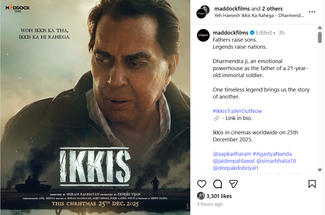 फिल्म के मेकर्स ने इंस्टाग्राम पर इक्कीस का पोस्टर शेयर करते हुए लिखा, पिता बेटों का पालन-पोषण करते हैं। महापुरुष राष्ट्र का निर्माण करते हैं। धर्मेंद्र जी, 21 वर्षीय अमर सैनिक के पिता के रूप में एक भावनात्मक शक्ति हैं।