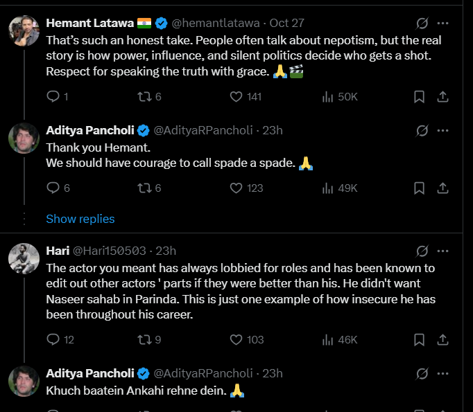 आदित्य पंचोली की पोस्ट पर कई यूजर्स ने रिएक्शन दिया है। एक यूजर ने लिखा, यह बहुत ईमानदार नजरिया है। लोग अक्सर नेपोटिज्म की बात करते हैं, लेकिन असली कहानी यह है कि शक्ति, प्रभाव और छिपी राजनीति तय करती है कि किसे मौका मिलेगा। सच्चाई को इतने सम्मानपूर्वक बोलने के लिए सम्मान।