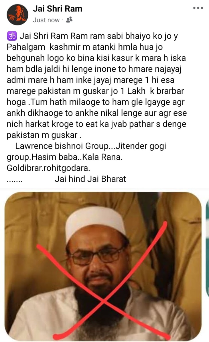 ख्यात गैंगस्टर लॉरेंस ने पहलगाम में हुए आतंकी हमले का बदला लेने की धमकी दी थी। लॉरेंस ग्रुप ने इसको लेकर सोशल मीडिया पर एक पोस्ट शेयर की थी, जिसमें पाकिस्तानी आतंकी हाफिज सईद की फोटो पर क्रॉस लगाया था। इसमें लॉरेंस गैंग ने लिखा था- तुमने हमारे निर्दोष लोगों को मारा है, अब हम पाकिस्तान में घुसकर एक ऐसा आदमी मारेंगे जो एक लाख के बराबर होगा। पूरी खबर पढ़ें…