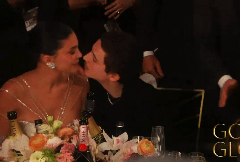 अवॉर्ड जीतने के बाद टिमोथी चालामेट ने काइली जेनर को किस किया।
