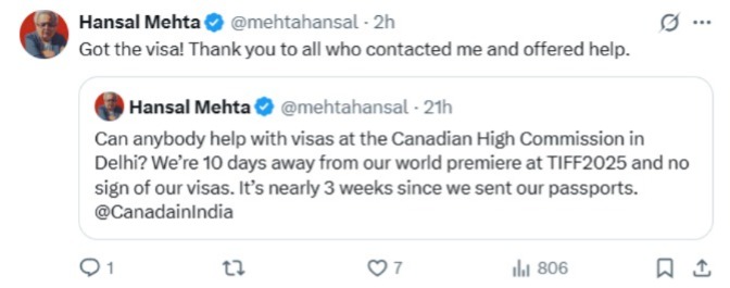 उन्होंने सोशल मीडिया प्लेटफॉर्म X पर मदद मांगते हुए लिखा, “क्या कोई दिल्ली स्थित कैनेडियन हाई कमीशन में वीजा को लेकर मदद कर सकता है? हम अपने वर्ल्ड प्रीमियर से सिर्फ 10 दिन दूर हैं और अभी तक वीजा नहीं मिला। पासपोर्ट भेजे हुए करीब 3 हफ्ते हो चुके हैं।”