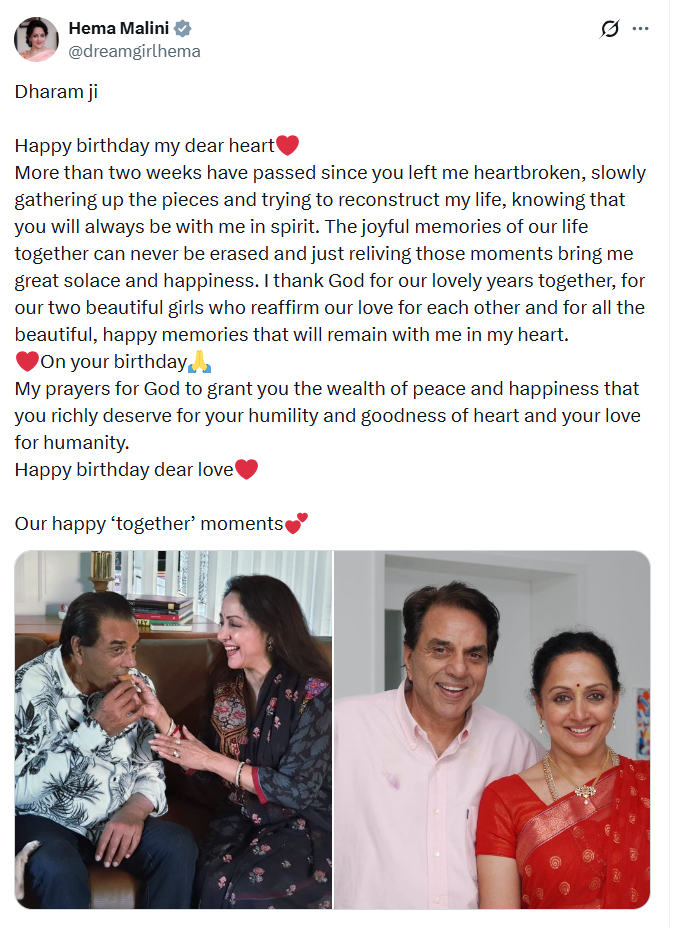 हेमा लिखती हैं- ‘’हैप्पी बर्थडे माई डियर हार्ट। दो हफ्ते से ज्यादा का समय बीत चुका है जब आप मेरा दिल तोड़कर मुझे छोड़कर चले गए। मैं धीरे-धीरे उन टुकड़ों को समेट कर फिर से अपनी जिंदगी संवारने की कोशिश कर रही हूं। यह जानते हुए कि आप हमेशा मेरे साथ ही रहेंगे।