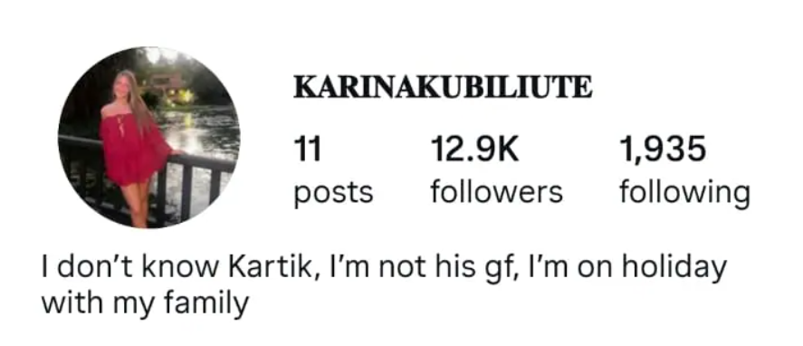 कार्तिक से डेटिंग की खबरों के साथ ही करीना कुबिलियूट के इंस्टाग्राम के कमेंट सेक्शन में दोनों का नाम जोड़ते हुए कई कमेंट्स किए जाने लगे। ऐसे ही एक कमेंट के जवाब में करीना कुबिलियूट ने लिखा, मैं कार्तिक की गर्लफ्रेंड नहीं हूं।