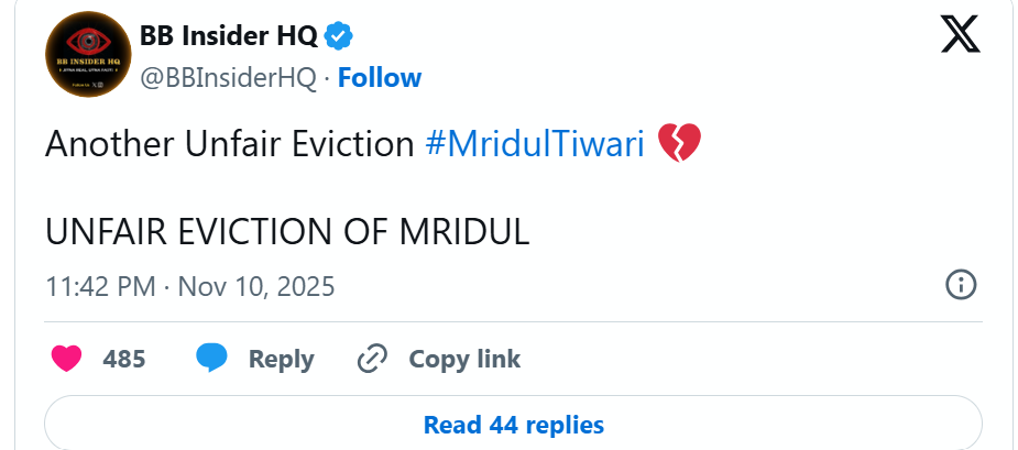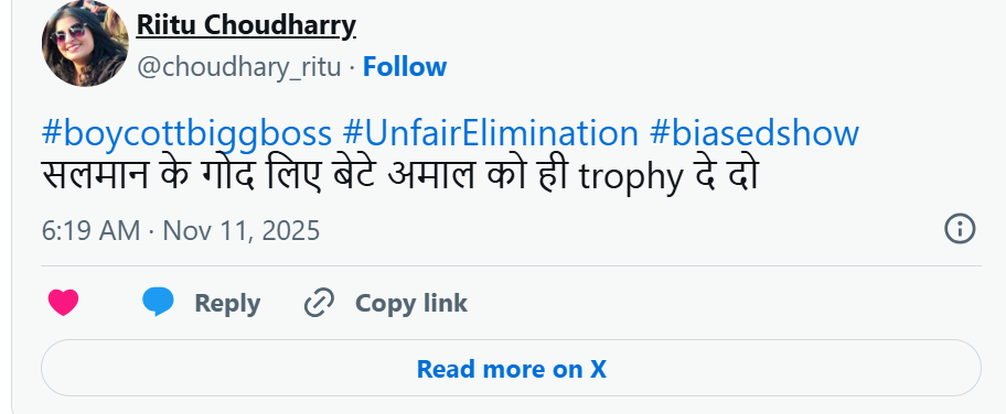 एक यूजर ने लिखा, अगर मृदूल नहीं तो बिग बॉस भी नहीं। दूसरे यूजर ने पोस्ट किया, हैशटैग बायकॉट बिग बॉस, हैशटैग अनफेयर एलिमिनेशन, हैशटैग बायस्ड शो। कुछ दर्शकों ने तो यहां तक कह दिया कि अब तो अमाल को ही ट्रॉफी दे दो।