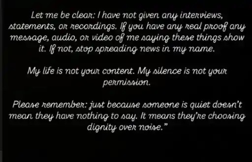 मैं साफ कर दूं, मैंने कोई इंटरव्यू, बयान या रिकॉर्डिंग नहीं दी है। अगर आपके पास कोई असली सबूत है। कोई मैसेज, ऑडियो या वीडियो जिसमें मैं ये बातें कह रही हूं तो दिखाइए। अगर नहीं है, तो कृपया मेरे नाम पर झूठी बातें फैलाना बंद कीजिए। मेरा जीवन आपका कंटेंट नहीं है। मेरी चुप्पी आपकी इजाज़त नहीं है। कृपया याद रखें, कोई चुप है, इसका मतलब यह नहीं कि उसके पास कहने को कुछ नहीं है। इसका मतलब है कि वह शोर के बजाय सम्मान को चुन रहा है।