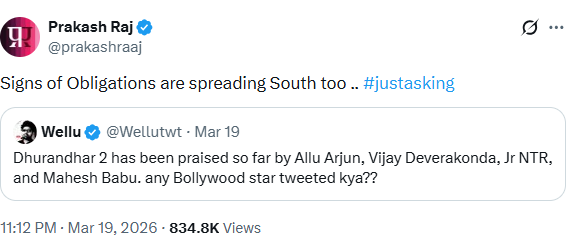 उन्होंने एक ट्वीट को रीट्वीट करते हुए साउथ स्टार्स पर भी निशाना साधा। उस ट्वीट में लिखा था कि धुरंधर 2 की तारीफ अल्लू अर्जुन, विजय देवरकोंडा, जूनियर एनटीआर और महेश बाबू ने की है, जबकि किसी बॉलीवुड स्टार ने प्रतिक्रिया नहीं दी।
