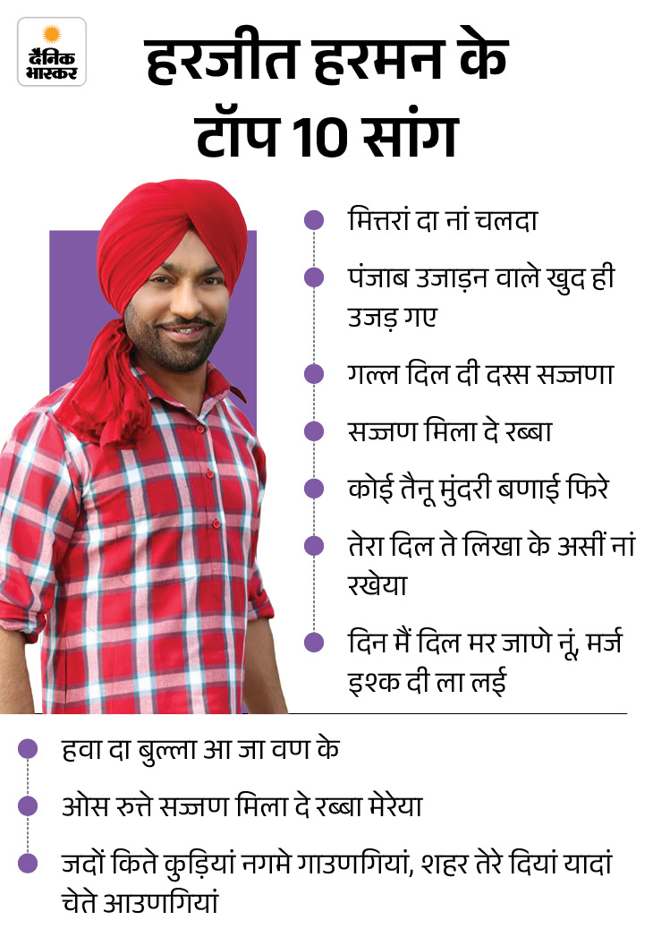 मित्तरां दा नां चलदा से हिट हुए हरजीत हरमन पंजाब के नाभा में पैदा हुए हरजीत हरमन ने पंजाबी म्यूजिक इंडस्ट्री में 2002 से डेब्यू किया। उनकी पहली एलबम जंजीर थी। इसका गीत मित्तरां दा ना चलदा, इतना हिट हुआ कि पंजाब के बच्चे-बच्चे की जुबान पर चढ़ गया। इसके बाद हरजीत हरमन ने एक के बाद एक कई हिट सांग दिए। हरजीत हरमन 100 से ज्यादा गीत गा चुके हैं। इस दिनों हरजीत हरमन नए गीतों की रिलीजिंग से ज्यादा स्टेज शो करते हैं। रोजाना होने वाले अपने स्टेज शो की वीडियो अपने इंस्टा अकाउंट पर शेयर करते हैं।
