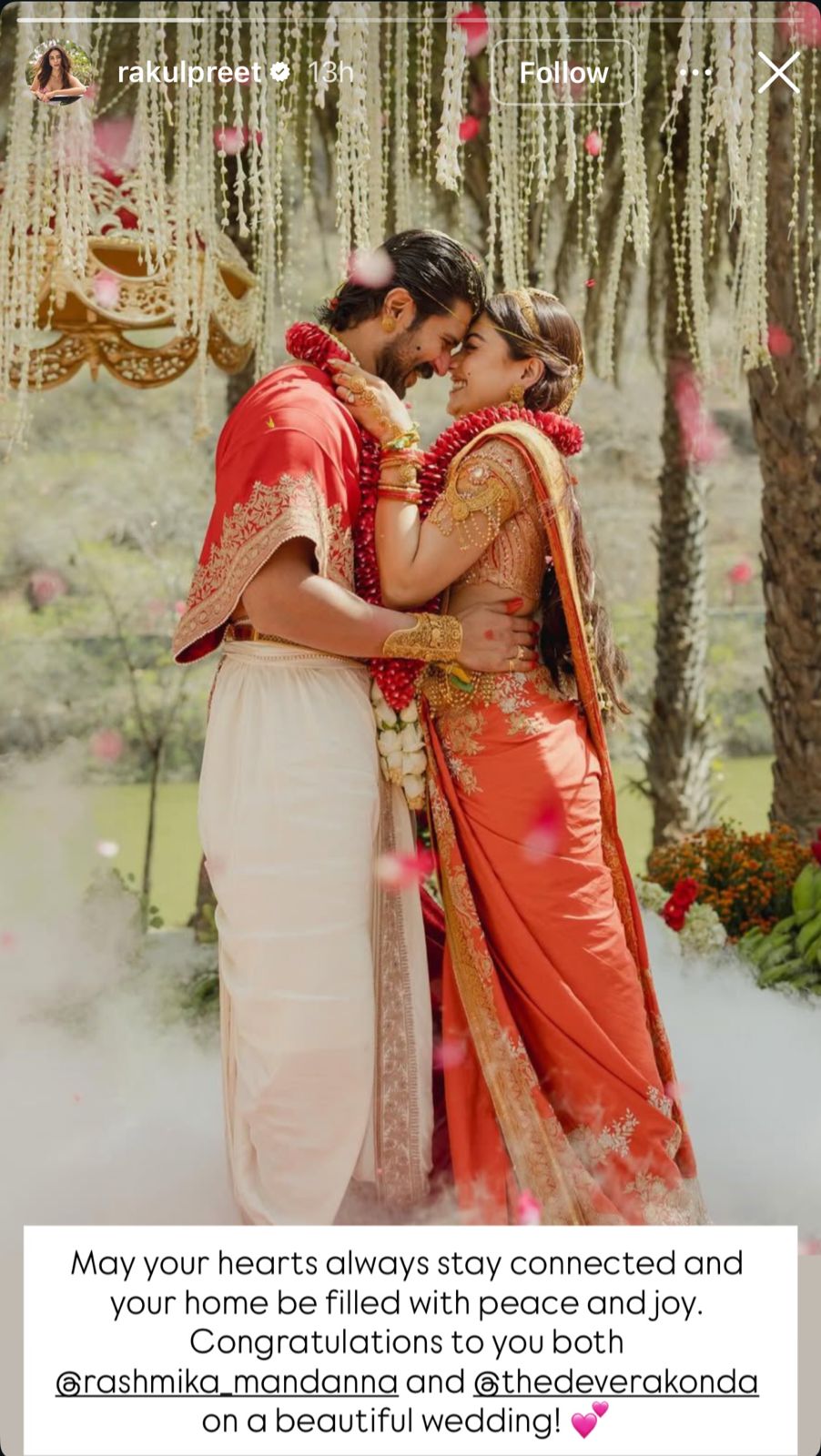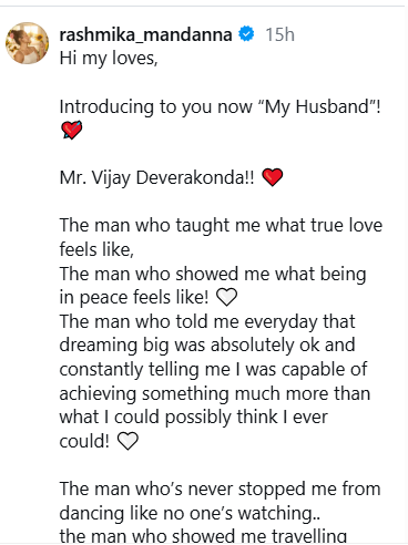 शादी के बाद रश्मिका और विजय ने इंस्टाग्राम अकाउंट पर फोटो शेयर की। रश्मिका ने विजय के लिए स्पेशल पोस्ट करते हुए लिखा,