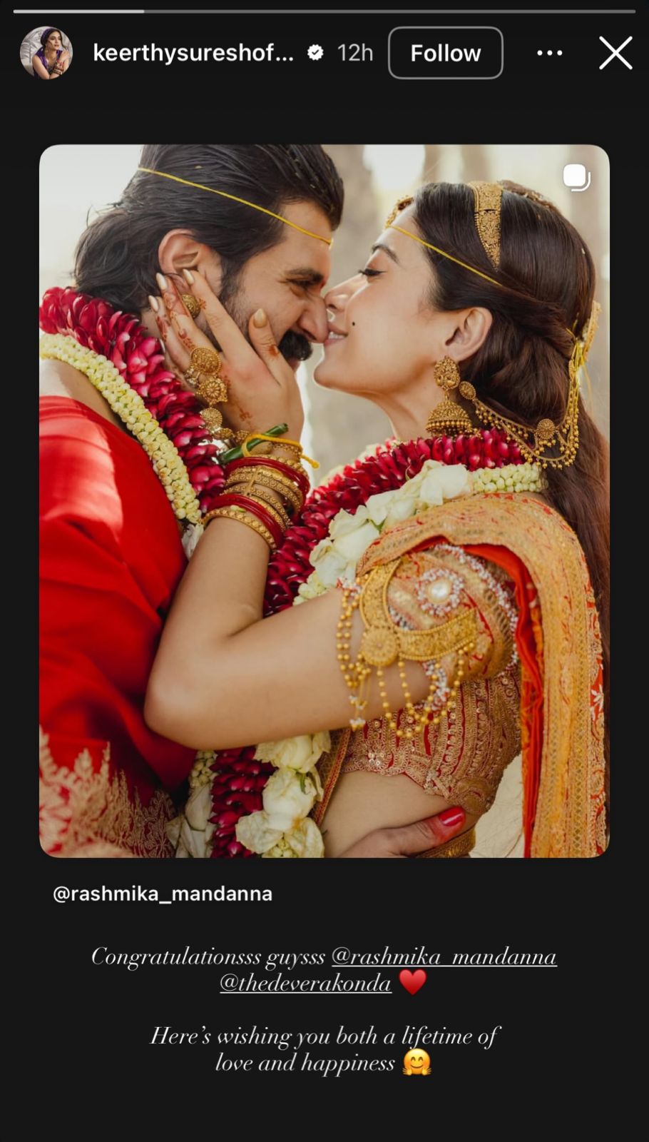 साउथ एक्ट्रेस कीर्ति सुरेश ने लिखा, “आप दोनों को शादी की बधाई। जिंदगी भर प्यार और खुशियां मिलें।”