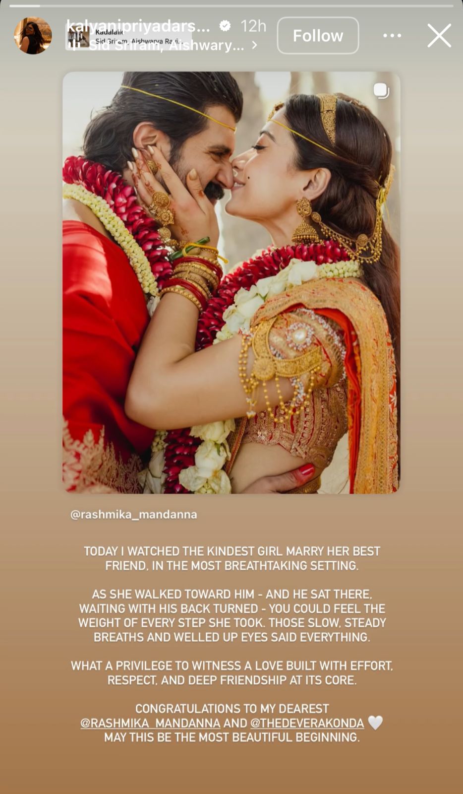 एक्ट्रेस कल्याणी प्रियदर्शन ने रश्मिका और विजय की शादी पर खास पोस्ट शेयर किया। उन्होंने इंस्टाग्राम स्टोरी पर शादी की तस्वीर लगाते हुए लिखा कि आज उन्होंने एक दयालु लड़की को अपने सबसे अच्छे दोस्त से शादी करते देखा। उन्होंने बताया कि जब रश्मिका उनकी ओर बढ़ रही थीं और विजय पीछे मुड़कर इंतजार कर रहे थे, तब हर कदम में भावनाएं साफ नजर आ रही थीं।
