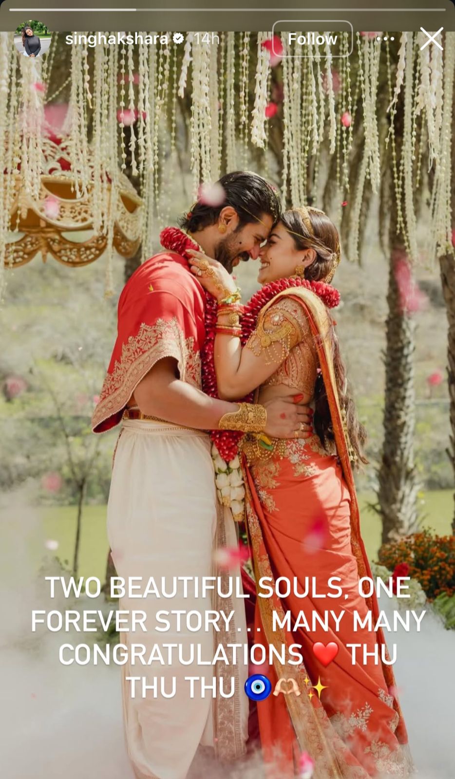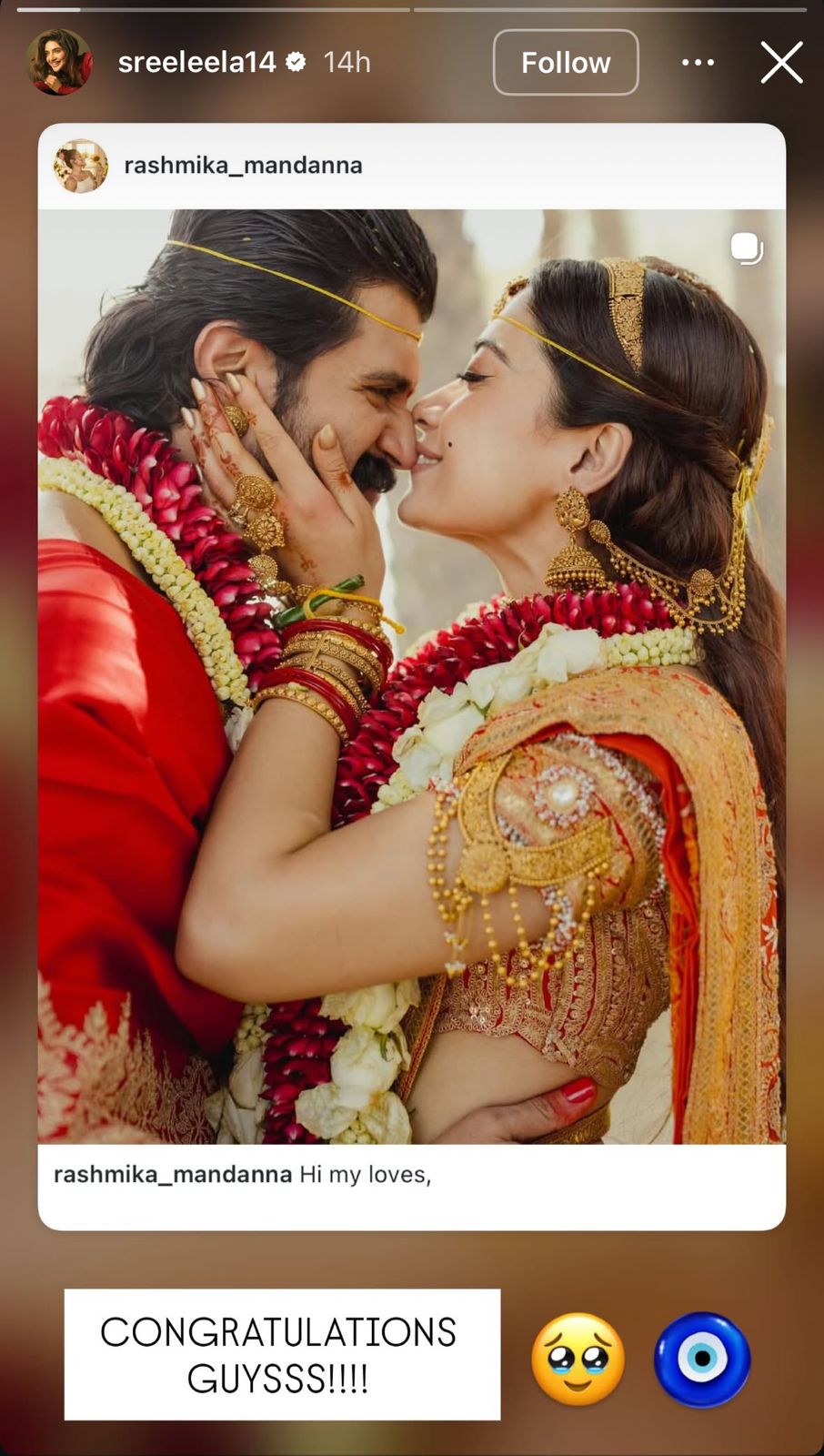 श्रीलीला ने स्टोरी पर फोटो शेयर कर दोनों को शादी की बधाई दी।