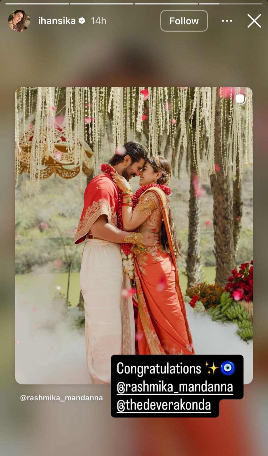 एक्ट्रेस हंसिका मोटवानी ने भी शादी की तस्वीर शेयर कर बधाई दी।