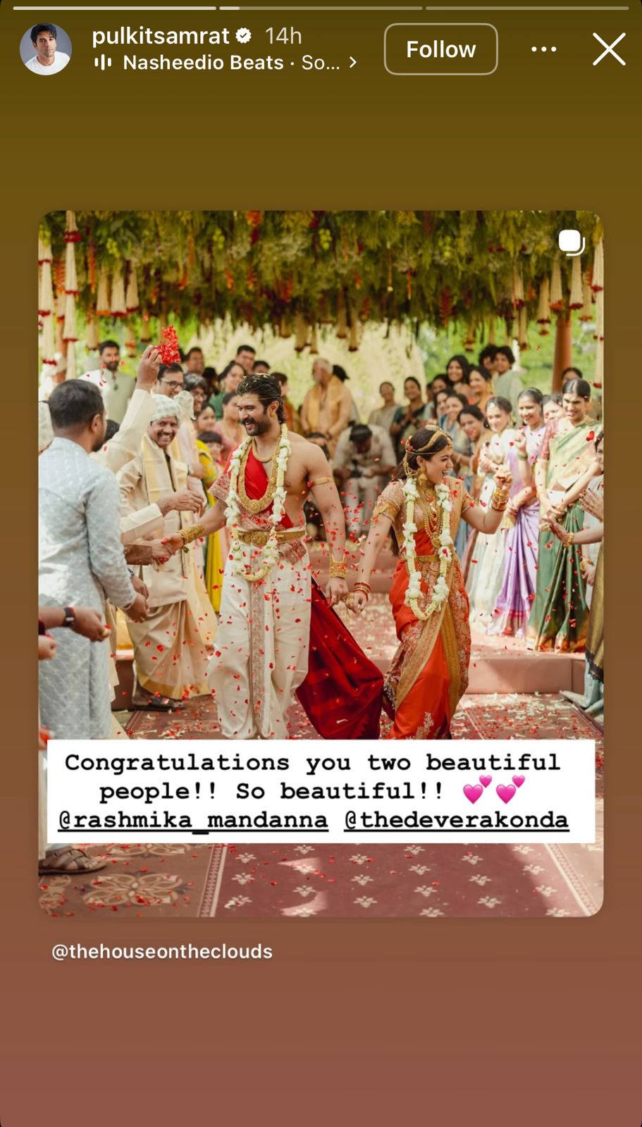 पुलकित सम्राट ने तस्वीर शेयर कर लिखा, “आप दोनों खूबसूरत लोगों को शादी की बधाई।”