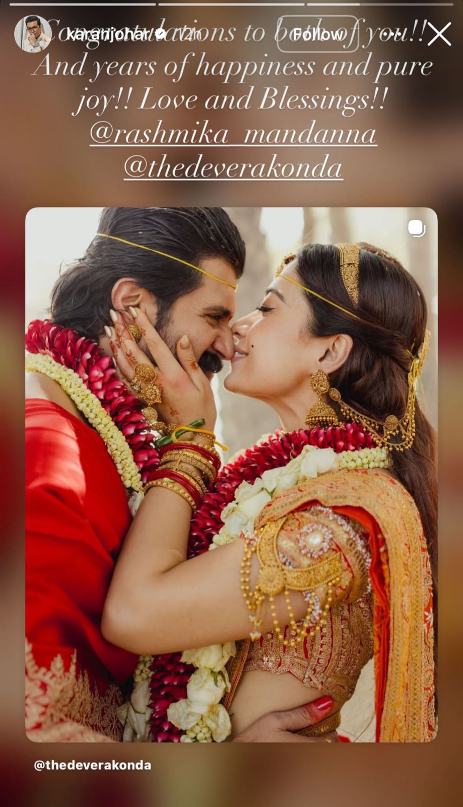 एक्ट्रेस सामंथा रुथ प्रभु ने इंस्टाग्राम स्टोरी पर कपल की फोटो शेयर कर शुभकामनाएं दीं। करण जौहर ने इंस्टाग्राम पर लिखा, “आप दोनों को बधाई। आने वाले साल खुशियों और प्यार से भरे हों।”