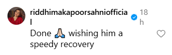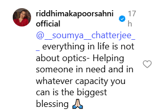रिद्धिमा का कमेंट सामने आने के बाद कई लोग उन्हें ट्रोल करने लगे। इसके बाद उन्होंने ट्रोलर्स को फटकार लगाते हुए लिखा- ‘हर चीज जिंदगी में दिखावे के लिए नहीं होती। किसी जरूरतमंद की मदद करना, चाहे जितनी भी कैपेसिटी हो, सबसे बड़ा आशीर्वाद है।’