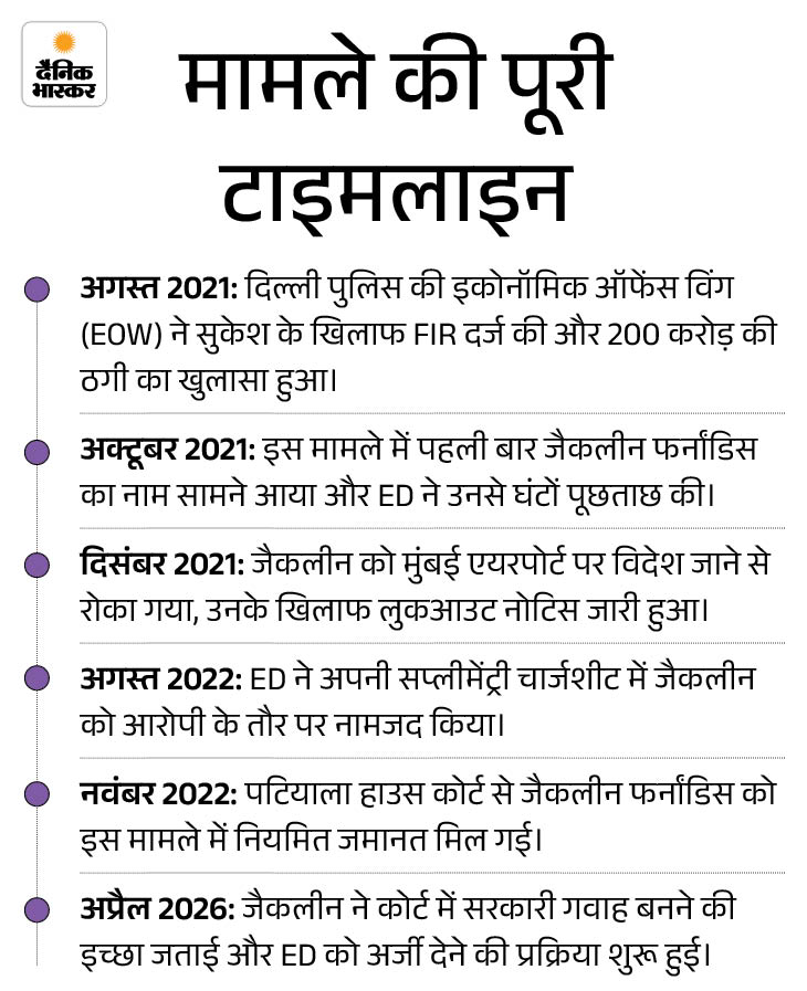 इस केस में जैकलीन से कई बार पूछताछ हो चुकी है। ईडी ने उन्हें सप्लीमेंट्री चार्जशीट में आरोपी बनाया है। केस रद्द करने की उनकी पिछली अर्जी दिल्ली हाई कोर्ट और सुप्रीम कोर्ट में खारिज हो गई थी।