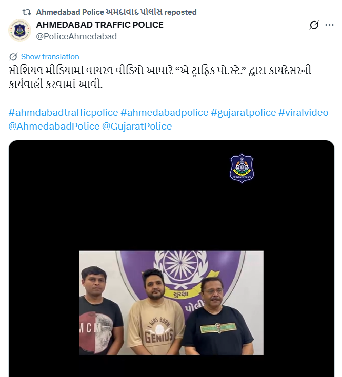 उनके स्टंट वीडियो को अहमदाबाद ट्रेफिक पुलिस के आधिकारिक X अकाउंट से जारी कर लिखा गया है, सोशल मीडिया पर वायरल हुए वीडियो के आधार पर “ए ट्रैफिक पुलिस स्टेशन” द्वारा कानूनी कार्रवाई की गई।