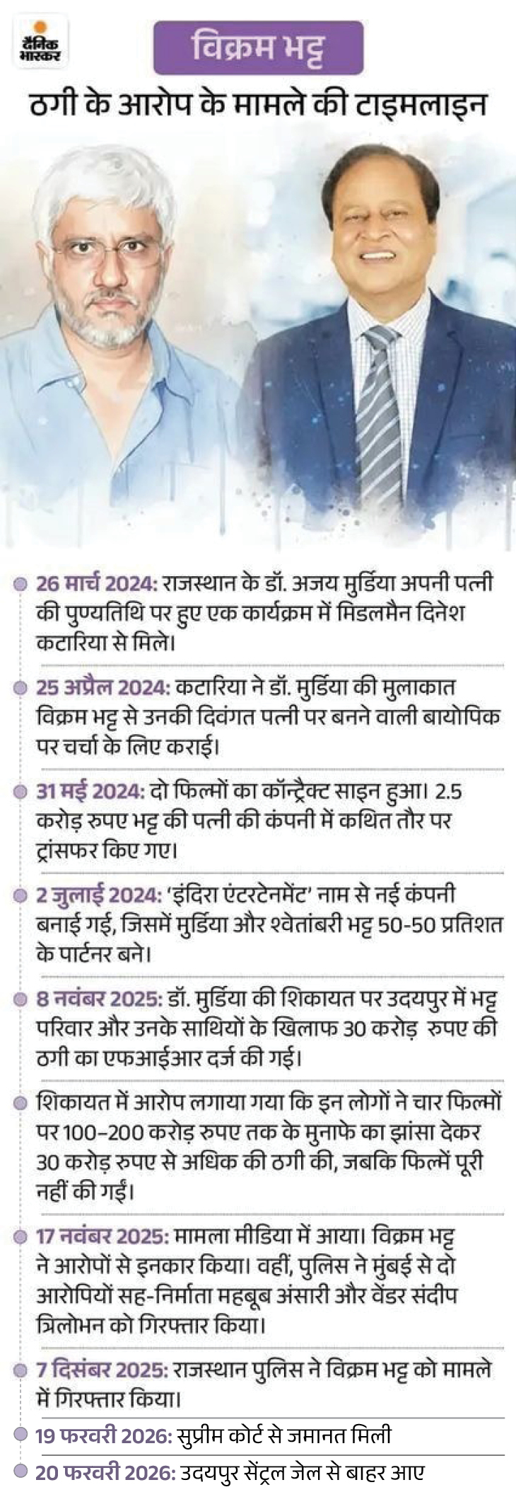 राजस्थान के इंदिरा ग्रुप ऑफ कंपनीज के मालिक डॉ. अजय मुर्डिया ने 17 नवंबर को विक्रम भट्ट समेत 8 लोगों के खिलाफ 30 करोड़ की धोखाधड़ी की FIR उदयपुर में दर्ज कराई थी।